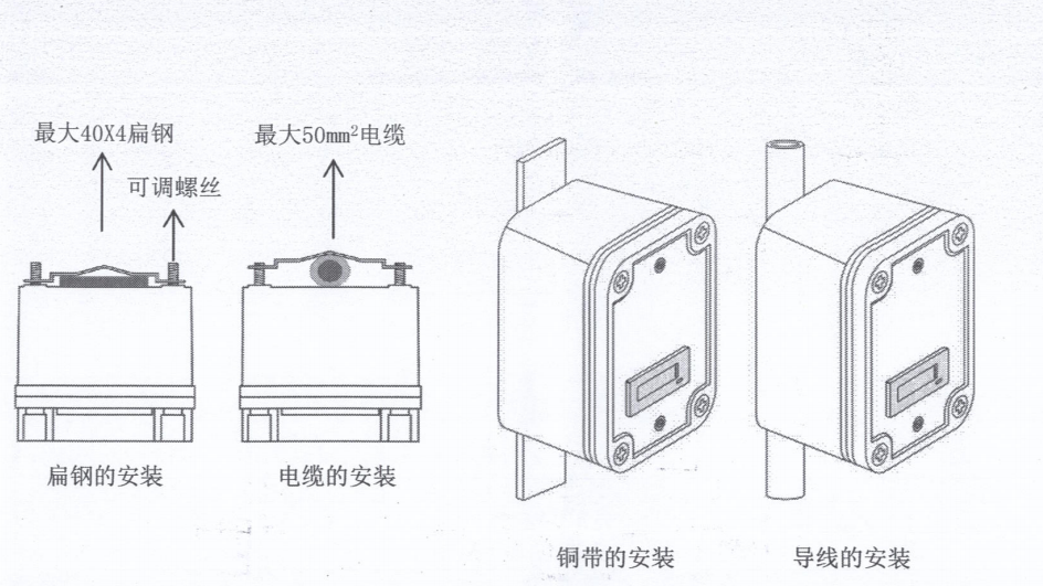 1. 雷擊計(jì)數(shù)器可固定在40*4扁鋼或50mm2以下電纜線、圓鋼上。