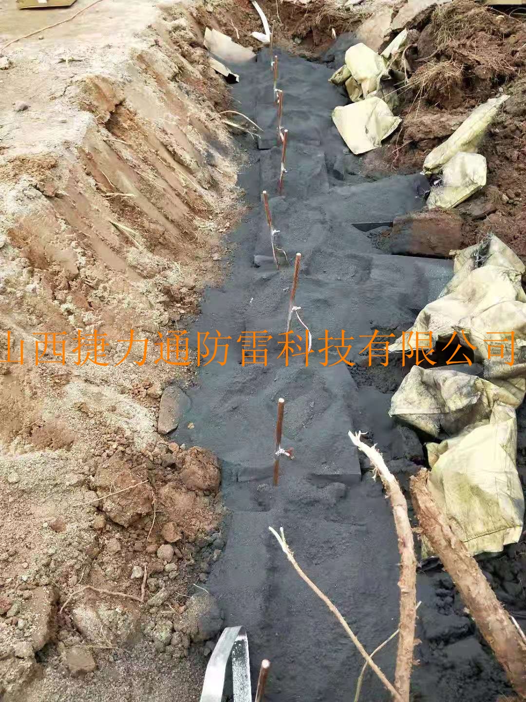 4、將攪拌均勻的降阻劑敷于接地溝或孔內(nèi),將金屬接地體包裹均勻,6~12小時后封土夯實。在敷設過程中,不得將泥沙等雜物接觸金屬接地體或混入降阻劑中。