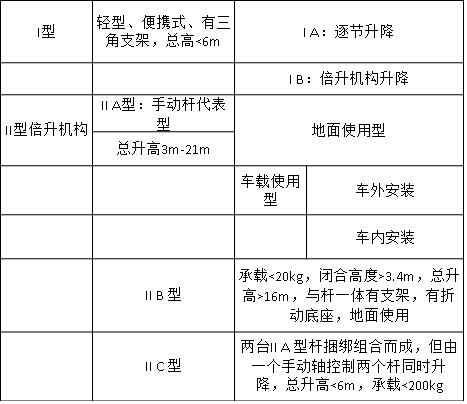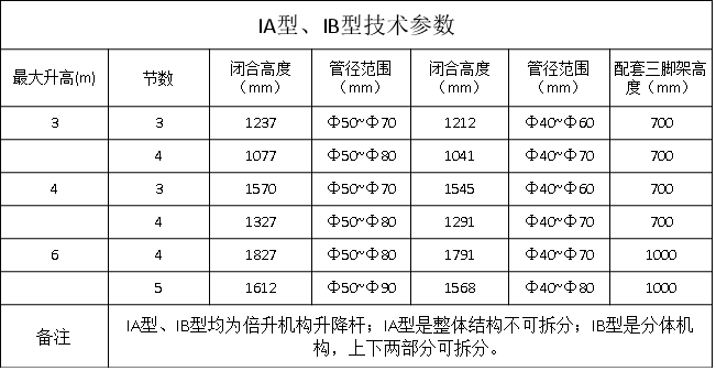 注:本廣生產(chǎn)的手動(dòng)升降桿.僅IA型是逐節(jié)升降.其余型號(hào)均為“倍伸機(jī)構(gòu)”.即各節(jié)活動(dòng)桿同時(shí)升降,速度快,升起后可見鑰絲繩外露.