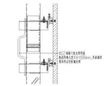 1、使用∮12mm鍍鋅圓鋼將豎龍骨焊接,焊接時采用雙面滿焊,搭接焊縫長度不小于100mm,, 焊接做到無夾渣,無咬肉,無氣泡現(xiàn)象,并將焊渣處理干凈,焊接表面采用富鋅漆作防腐處理。
