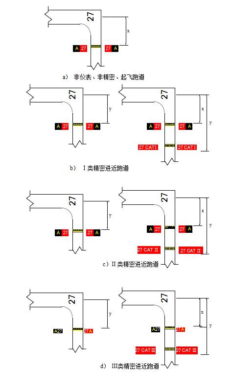 注:距離x是按表17確定的,距離y是根據(jù)ILS/MLS的臨界/敏感區(qū)的邊界確定的。左邊的圖為 y-x≤15 m 時的設置情況。