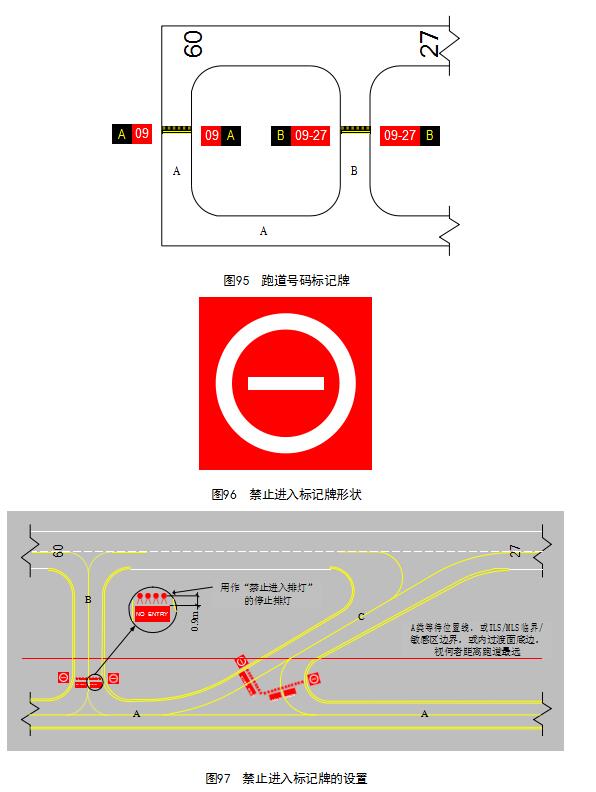 9.7.3.8 當需要禁止航空器進入一個地區(qū)時應設置禁止進入標記牌,其形狀如圖 96 所示。“禁止進入” 標記牌應設置在禁止進入地區(qū)起始處的滑行道兩側,面對駕駛員。