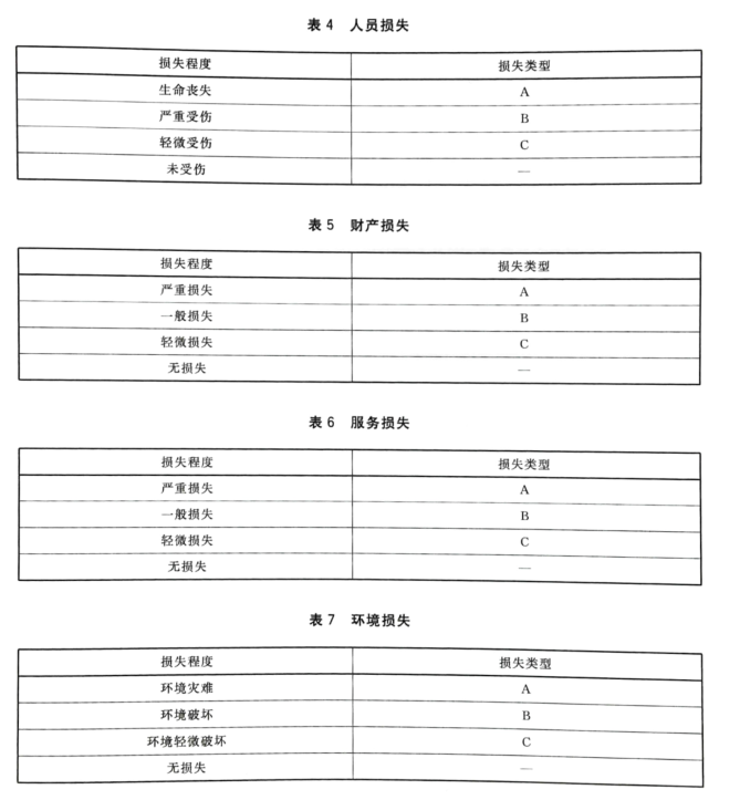 根據(jù)表3列出的危險情況,評估關(guān)于人員(見表4).財產(chǎn)(見表5).服務(wù)(見表6)和環(huán)境(見表7)的不同損失以便確定損失(A.B.C或- - )類型。